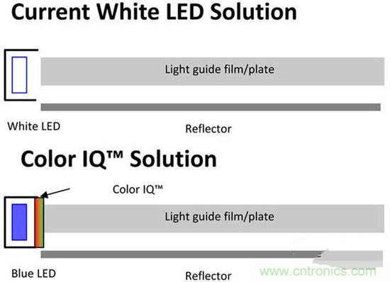 (這是顯示屏背光的橫截面圖,上方是傳統(tǒng)W-LED背光方案,下圖為量子點背光方案,長條可以理解為燈管,左側(cè)即是光源。在量子點背光方案中,除了左側(cè)的藍色LED燈外,右邊部分加上了紅色與綠色量子點)