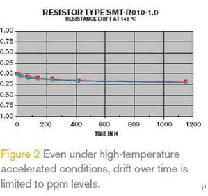 圖2 是表面貼裝電阻的典型長期穩(wěn)定性曲線,可以看出在140°C下老化1000小時(shí)后阻值只有大約 0.2%的輕微漂移,這是由于生產(chǎn)過程中輕微變形而導(dǎo)致的晶格缺損造成的。阻值漂移很大程度上由高溫決定,因此在較低的溫度下比如+100°C,這種漂移實(shí)際是檢測不出來的。