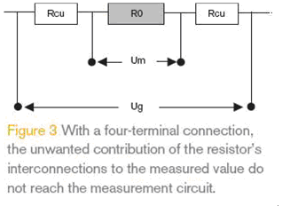 在低阻值電阻中,端子的阻值和溫度系數(shù)的影響往往是不能忽略的,實(shí)際設(shè)計(jì)中應(yīng)充分考慮這些因素,可以使用附加的取樣端子直接測量金屬材料兩端的電壓。如圖3所示,一個(gè)四端子的連接將允許測量系統(tǒng)實(shí)際用到的阻值為R0,而普通的連接的阻值為R0+2xRCu 。例如,10 mm長0.3 mm線徑的銅線會(huì)增加2.4 mΩ的RCu阻值,4mm長0.2mm寬 35 μm厚度的PCB引線的RCu阻值是10 mΩ