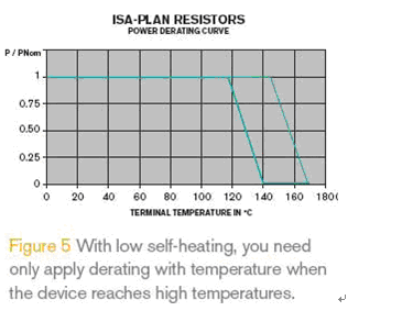 這種結(jié)構(gòu)的電阻可以在非常高的溫度下滿負(fù)荷工作,如圖5所示在很高的溫度下才出現(xiàn)功率折減;同時(shí),電阻材料的溫度可以維持在較低水平,這就可以有效改善電阻的長期穩(wěn)定性和因溫度而引起的阻值變化。