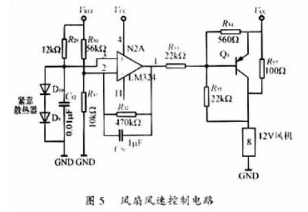 風(fēng)扇風(fēng)速控制電路見圖5。利用二極管正向管壓降隨溫度升高而呈下降趨勢的特性,將D9、D10做為散熱器溫度采樣器件。方法是將D9、D10兩二極管緊靠在散熱器上,當(dāng)散熱器隨輸出功率加大而溫度升高時,運放N2A正相輸入端電平降低,輸出低電平使三極管Q3開始導(dǎo)通,風(fēng)機上電壓升高,轉(zhuǎn)速升高,最終到達最高轉(zhuǎn)速。當(dāng)負(fù)載較輕,使散熱器溫度低于50℃時,N2A輸出高電平,Q3不導(dǎo)通,輔助電源12.5V經(jīng)電阻R57降壓給風(fēng)機供電,風(fēng)機處于低速、低噪聲運行狀態(tài)。此電路可以提高風(fēng)機工作壽命,增加電路可靠性,亦可在小負(fù)載情況下,減少風(fēng)機帶來的噪聲。