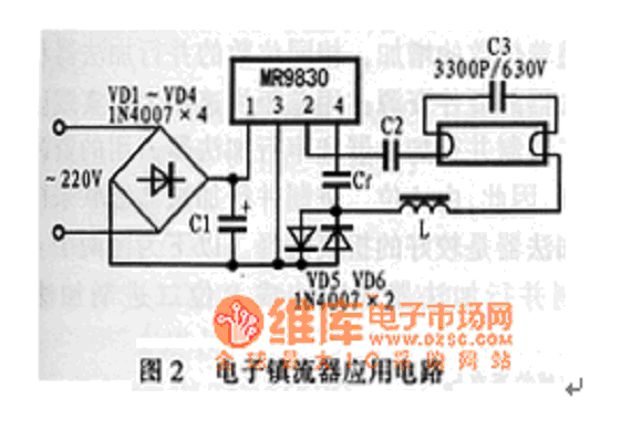 MR9830可用作日光燈和節(jié)能燈的電子鎮(zhèn)流器。具體電路如圖2所示。
