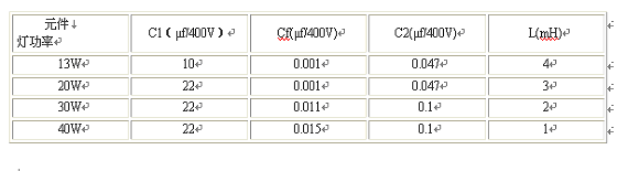 用MR9830組裝的電子鎮(zhèn)流器能可*地驅動40W以下功率的各種日光燈和節(jié)能燈。而且體積小,效率高,故障率極低,組裝工藝也非常簡單。圖2中的C1、C2、及Cf和電感L的參數(shù)可根據(jù)需推動日光燈管、節(jié)能燈管的功率不同而不同,具體的參數(shù)設置可參見表1。