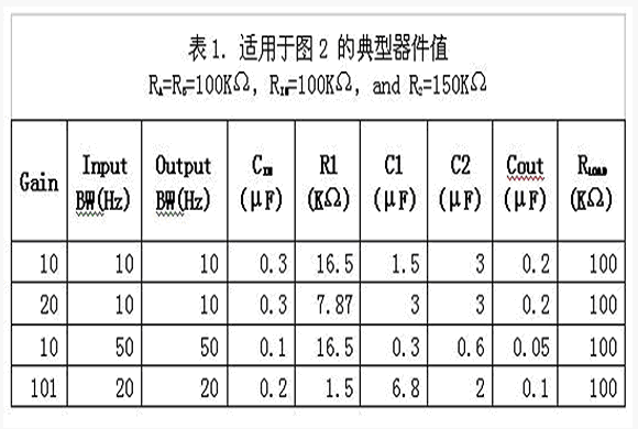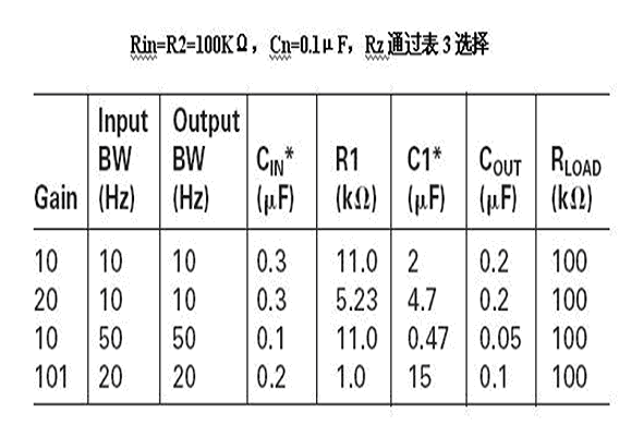 設(shè)計單電源運算放大器電路,需要考慮輸入偏置電流誤差、電源抑制、增益、以及輸入與輸出線路帶寬等等。然而普通的應(yīng)用設(shè)計是可以通過查表來獲得,見表1。在單電源電壓為15V或12V時偏置分壓的兩個電阻通常選用100kΩ,這樣可以在電源消耗與輸入偏置電流誤差之間合理的折中。5V單電源偏置分壓電阻減小到一個比較低的值,例如42kΩ。還有些在3.3V應(yīng)用中偏置分壓電阻選在27kΩ左右。