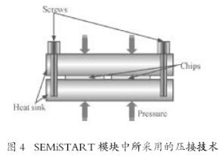 SEMiSTART模塊中,用于芯片的連接技術(shù)基于壓接技術(shù),兩個(gè)晶閘管芯片反并聯(lián)連接并被壓在兩個(gè)散熱器之間。