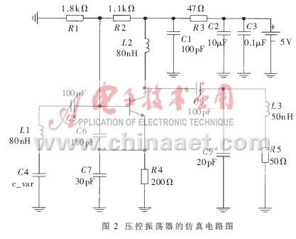 壓控振蕩器(VCO)是鎖相環(huán)路的重要組成部分。隨著電子技術(shù)的發(fā)展,出現(xiàn)了許多集成的VCO芯片??紤]到高頻率穩(wěn)定度、低相噪的要求,這里采用Agilent公司生產(chǎn)的低噪聲晶體管HBFP0450來設(shè)計VCO。常用的VCO一般有三種:晶體壓控振蕩器、LC壓控振蕩器和RC壓控振蕩器。對于超高頻段的VCO,采用LC振蕩器形式;為了提高頻率穩(wěn)定性,采用了克拉潑電路,并進行了相角補償。