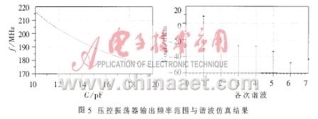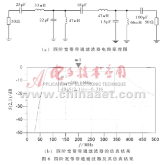 從圖5可以看出,壓控振蕩器的輸出頻率范圍為175MHz~217MHz,基波(頻率為214MHz時)輸出功率為7.911dBm,二次諧波為-16.368dBm,可見有效地抑制了諧波分量。在實際應(yīng)用中,對諧波濾除的要求比較高,可以在輸出端接入寬帶濾波器,其電路原理圖和仿真結(jié)果見圖6。這樣,可以更有效地濾除高次諧波,同時有利于輸出匹配,減小負載對輸出功率的影響。