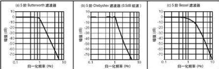 圖2 Butterworth (a)、Chebyshev (b)和Bessel (c)低通5階濾波器的頻率響應(yīng)