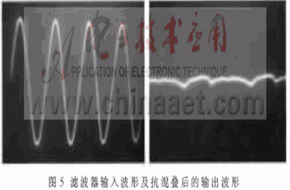 實(shí)驗(yàn)觀察得知,經(jīng)過開關(guān)電容濾波后的信號(hào)存在較多的“毛刺”和“陰影”。分析發(fā)現(xiàn),這主要是高頻混疊所致。本文作者通過大量的實(shí)驗(yàn)探索提出了在開關(guān)電容帶阻濾波電路的輸出端接入抗混疊濾波器的精簡(jiǎn)解決方法,采用一階低通濾波器實(shí)現(xiàn)抗混疊濾波。同時(shí),接入的抗混疊濾波器還起到消除開關(guān)噪聲、時(shí)鐘噪聲等高頻干擾和平滑濾波的目的。濾波器輸入波形及輸出波形如圖5所示。