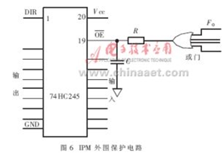 方案一 PWM接口電路前置74HC245、74HC244等帶控制端的三態(tài)收發(fā)器,如圖6所示。IPM的控制信號經(jīng)過74HC245的輸入、74HC245的輸出后送至IPM接口電路;各個IPM的故障輸出信號經(jīng)光耦隔離輸出后得到高電平FO,送入或門,或門輸出經(jīng)過R-C低通濾波器后,送入74HC245的使能端/OE。IPM正常工作時,或門輸出為低電平,74HC245選通;IPM故障報警時,或門輸出為高電平,74HC245所有輸出置為高阻,封鎖各個IPM的控制信號,關斷IPM;實現(xiàn)了保護功能。