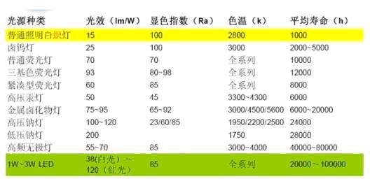 表1:大功率LED在壽命上具有很大優(yōu)勢。