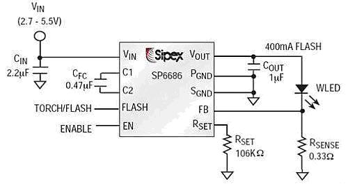 3)SP6686、SP6685和SP7685系列產(chǎn)品可提供300mA至1.2A閃光電流,適用于200萬像素及以上相機應(yīng)用,圖3為該系列產(chǎn)品的典型應(yīng)用電路:
