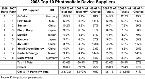 供應(yīng)量位居第三的是上年排名第二的尚德太陽能電力有限公司(Suntech Power Holdings),上年排名第三的夏普以與尚德的0.2個百分點之差下滑至第四。不過,在銷售額方面夏普位居第三,尚德以0.1個百分點之差退居第四。IC Insights評價夏普的薄膜硅太陽能電池增產(chǎn)及擴(kuò)大銷售的計劃“很有野心”,并預(yù)測如果按照計劃推進(jìn),夏普將有望盡快奪回市場份額。