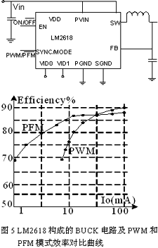 對(duì)于額定功率時(shí)工作在PWM模式的開關(guān)電源,,也可以通過切換至PFM模式提高待機(jī)效率,即固定開通時(shí)間,調(diào)節(jié)關(guān)斷時(shí)間,負(fù)載越低,關(guān)斷時(shí)間越長(zhǎng),工作頻率也越低。圖5是采用NS公司的LM2618控制的Buck轉(zhuǎn)換器電路和分別采用PWM和PFM控制方法的效率比較曲線。由圖可見,在輕載時(shí)采用PFM模式的電源效率明顯大于采用PWM模式時(shí)的效率,且負(fù)載越低,PFM效率優(yōu)勢(shì)越明顯。