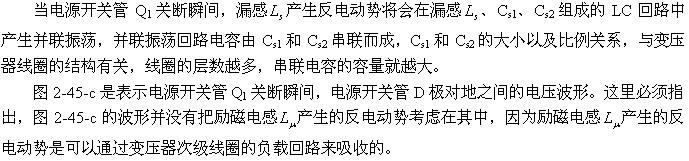 圖2-47中的D1、R1、C1是抑制漏感以及勵磁電感產(chǎn)生反電動勢和振鈴電壓幅度的有效電路。當(dāng)變壓器初級漏感以及勵磁電感產(chǎn)生反電動勢時,反電動勢通過二極管D1對電容器C1進(jìn)行充電,相當(dāng)于電容器把反電動勢的能量吸收掉,從而降低了反電動勢和振鈴電壓的幅度。