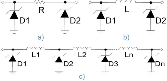 圖2:集成型EMI濾波+ESD保護(hù)方案:a)π型RC;b)π型LC;c)LC梯形