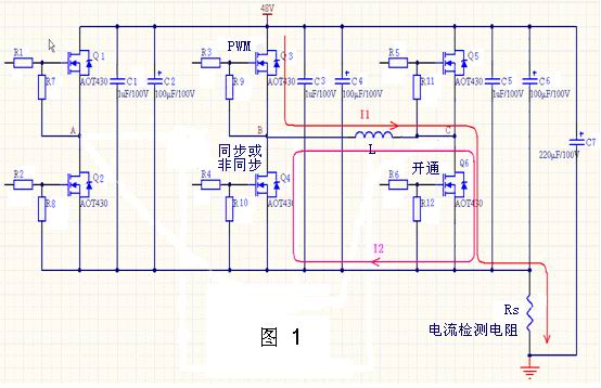 由于無(wú)刷電機(jī)具有高扭矩、長(zhǎng)壽命、低噪聲等優(yōu)點(diǎn),已在各領(lǐng)域中得到了廣泛應(yīng)用,其工作原理也已被大家廣為熟知,這里不再詳述。國(guó)內(nèi)電動(dòng)車電機(jī)控制器通常工作方式為三相六步,功率級(jí)原理圖如圖1所示,其中Q1, Q2為A相上管及下管;Q3, Q4為B相上管及下管;Q5, Q6為C相上管及下管。MOSFET全部使用AOT430。 MOSFET工作在兩兩導(dǎo)通方式,導(dǎo)通順序?yàn)镼1Q4→Q1Q6→Q3Q6→Q3Q2→Q5Q2→Q5Q4→Q1Q4,控制器的輸出通過(guò)調(diào)整上橋PWM脈寬實(shí)現(xiàn),PWM頻率一般設(shè)置為18KHz以上。