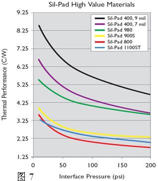圖7為SilPad系列導(dǎo)熱材料對(duì)TO-220封裝的導(dǎo)熱性能隨壓力變化的曲線。