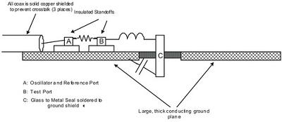 測(cè)試電感性能的最有效方法就是將被測(cè)試電感放置在最終開關(guān)電源電路上,然后對(duì)此電路的效率進(jìn)行測(cè)量。但是,這種測(cè)試方法需要有最終電路,不易采用?,F(xiàn)在,有一種相對(duì)簡(jiǎn)單的測(cè)試方法,可以在設(shè)計(jì)開關(guān)電源前對(duì)電感的磁芯損耗進(jìn)行測(cè)試(在其設(shè)定的開關(guān)頻點(diǎn)上)。首先,將磁芯串連放置在低損耗電容介質(zhì)上(比如鍍銀云母)。然后,用一系列共振模驅(qū)動(dòng)。其中介質(zhì)的電容值需要與被測(cè)電感的開關(guān)頻率一致。最后采用網(wǎng)絡(luò)分析儀來完成整個(gè)測(cè)試過程(信號(hào)發(fā)生器加上一個(gè)射頻伏特計(jì)或者功率計(jì)也可以完成測(cè)試)。測(cè)試設(shè)備的結(jié)構(gòu)如圖2所示