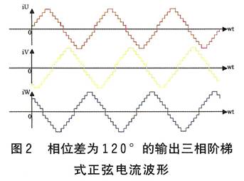 以上分析表明,對于三相永磁同步電機(jī),當(dāng)三相繞組輸入三相對稱的正弦電流時,由于在內(nèi)部產(chǎn)生圓形旋轉(zhuǎn)磁場,電機(jī)的輸出轉(zhuǎn)矩為恒值。因此,將交流伺服控制原理應(yīng)用到三相混合式步進(jìn)電機(jī)驅(qū)動系統(tǒng)中,輸入的220V交流,經(jīng)整流后變?yōu)橹绷?,再?jīng)脈寬調(diào)制技術(shù)變?yōu)槿冯A梯式正弦波形電流(見圖2),它們按固定時序分別流過三路繞組,其每個階梯對應(yīng)電機(jī)轉(zhuǎn)動一步。