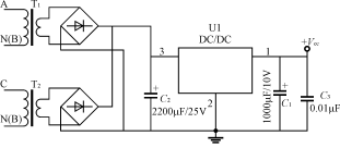 三相電度表有三相三線,三相四線,輸入電壓有3×(220~240)V/380~400V、3×57V/100V等。三相電度表供電電路可以參考單相電度表電源的設(shè)計(jì)方法,對(duì)于三相四線供電電路,可以在每一相線對(duì)零線之間接1只線性變壓器,共3只線性變壓器;對(duì)三相三線可以取一相如Β相作為公共地線,A、C相對(duì)Β相接2只線性變壓器。這些變壓的副邊單獨(dú)整流后再將輸出的正極接在一起、負(fù)極接在一起,經(jīng)電容濾波后,再通過DC/DC變換器輸出穩(wěn)定電壓,向電度表供電,如圖5所示。
