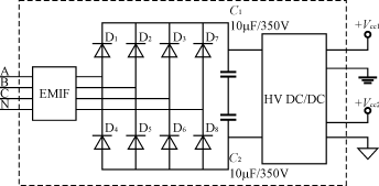 這種供電方式體積和重量較大,成本也較高,顯然按以上電路連接時(shí),對(duì)三相四線供電時(shí)不能缺零線,對(duì)三相三線供電時(shí)不能缺公共地線,如B相;另外,有的供電局用戶要求,三相電度表輸入端任意兩線有電壓輸入時(shí)都能工作,則圖5的設(shè)計(jì)便不能達(dá)到目的;當(dāng)采用三相電度表專用開關(guān)電源模塊供電時(shí),可解決以上問題,其內(nèi)部結(jié)構(gòu)圖如圖6所示。