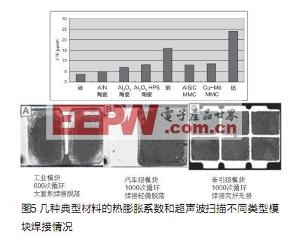 IGBT模塊由多層不同材料組成(見圖3),每種材料具有不同的CTE(熱膨脹系數(shù)),CTE的差別會(huì)影響功率模塊的使用壽命,當(dāng)模塊使用時(shí),溫度的變化會(huì)在不同層間產(chǎn)生機(jī)械應(yīng)力而導(dǎo)致焊接脫落,我們的目標(biāo)是選用熱膨脹系數(shù)差別盡可能小的材料來(lái)進(jìn)行焊接組合。但另一方面,即使它們的熱膨脹系數(shù)十分匹配,因?yàn)椴牧媳旧淼某杀究赡軙?huì)太高,或者在生產(chǎn)過程中難以被加工或加工成本太高。例如列車牽引應(yīng)用中的AlSiC基板。熱膨脹系數(shù)和襯底幾乎相同,因此有更好的熱循環(huán)特性。但對(duì)混合動(dòng)力車應(yīng)用因成本過高而很難被接受。