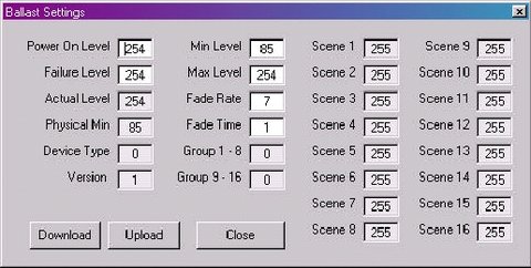 當程序第一次加載時,“電子鎮(zhèn)流器設置(Ballastsetting)”窗口將沒有數(shù)據(jù)顯示,要完成一只實際電子鎮(zhèn)流器的設置,應在主界面設置適應的地址,并按下“電子鎮(zhèn)流器設置(Ballastsetting)”窗口中的“Down/Load”按鈕。