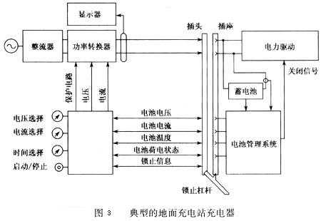 圖3為一典型的地面充電站中充電器的方案,該充電器由一個能將輸人的交流電轉(zhuǎn)換為直流電的整流器和一個能調(diào)節(jié)直流電功率的功率轉(zhuǎn)換器組成,通過把帶電線的插頭插入電動汽車上配套的插座中,直流電能就輸入蓄電池對其充電。充電器設(shè)置了一個鎖止杠桿以利于插入和取出插頭,同時杠桿還能提供一個確定已經(jīng)鎖緊的信號以確保安全。根據(jù)充電器和車上電池管理系統(tǒng)相互之間的通訊,功率轉(zhuǎn)換器能在線調(diào)節(jié)直流充電功率,而且充電器能顯示充電電壓、充電電流、充電量和充電費用等。