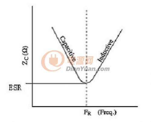 從上圖,我們很清楚的看出:電容在整個(gè)頻段,并非都是表現(xiàn)為電容的特性,而是在低頻的情況(諧振頻率以下),表現(xiàn)為電容性的器件,而當(dāng)頻率增加(超過(guò)諧振頻率)的時(shí)候,它漸漸的表現(xiàn)為電感性的器件。也就是說(shuō)它的阻抗隨著頻率的增加先減小后增大,等效阻抗的最小值發(fā)生在串聯(lián)諧振頻率時(shí),這時(shí)候,電容的容抗和感抗正好抵消,表現(xiàn)為阻抗大小恰好等于寄生串聯(lián)電阻ESR。