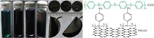 圖1: 不同PANi含量的PSS-GS/PANi“紙”電極(左)和PSS-GS與PANi納米纖維之間的靜電吸附示意圖(右)