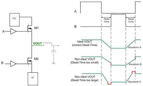 D類(lèi)放大器死區(qū)時(shí)間(即兩個(gè)開(kāi)關(guān)均處于關(guān)閉狀態(tài)時(shí)的時(shí)間段)直接影響到效率和THD。過(guò)于短暫的死區(qū)時(shí)間會(huì)引起直通電流,降低效率,過(guò)長(zhǎng)的死區(qū)時(shí)間又會(huì)增大THD,這會(huì)給音頻保真度帶來(lái)不利影響。