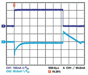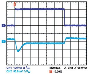 輸出電容還會(huì)影響調(diào)節(jié)器對(duì)負(fù)載電流變化的響應(yīng)??刂骗h(huán)路的大信號(hào)帶寬有限,因此輸出電容必須提供快速瞬變所需的大多數(shù)負(fù)載電流。當(dāng)負(fù)載電流以500mA/μs的速率從1mA變?yōu)?00mA時(shí),1μF電容無(wú)法提供足夠的電流,因而產(chǎn)生大約80mV的負(fù)載瞬態(tài),如圖1所示。當(dāng)電容增加到10μF時(shí),負(fù)載瞬態(tài)會(huì)降至約70mV,如圖2所示。當(dāng)輸出電容再次增加并達(dá)到20μF時(shí),調(diào)節(jié)器控制環(huán)路可進(jìn)行跟蹤,主動(dòng)降低負(fù)載瞬態(tài),如圖3所示。這些示例都采用線性調(diào)節(jié)器ADP151,其輸入和輸出電壓分別為5V和3.3V。