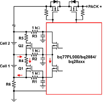 由于使用集成FET解決方案的無源電池平衡技術的平衡能力有限,因此電池差異或失衡率可能超過電池平衡。另外,由于存在低旁路電流,它可能會占用幾個周期來對一般失衡進行校正。利用現(xiàn)有組件設計一些外部旁路電路可以增強電池平衡(請參見圖6和圖7)。在圖6中,當決定對某節(jié)電池進行平衡時內(nèi)部平衡MOSFET首先開啟。這便形成一條低電流通路,其通過連接電池端(電池1和電池2)及IC引腳的外部濾波器電阻。當內(nèi)部FET柵-源電壓在電阻中形成,該外部MOSFET便被開啟。其缺點是,鄰近電池無法快速、同時獲得平衡。例如,如果鄰近內(nèi)部FET被開啟,則Q2不能被開啟,因為沒有通過R2的電流。