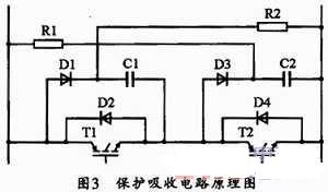 由于電路中分布電感的存在,加之IGBT開關(guān)速度較高,當IGBT關(guān)斷時及與之并接的反向恢復二極管逆相恢復時,會產(chǎn)生很大的浪涌電壓Ldi/dt,從而威脅IGBT的安全。因此必須采取措施抑制浪涌電壓,保護IGBT不被損壞。可以采用加裝保護吸收電路的辦法來抑制浪涌電壓。其原理圖如圖3所示,該保護吸收電路有良好的抑制效果,具有保護吸收中發(fā)生損耗小的優(yōu)點。
