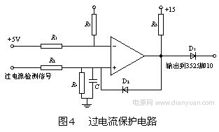 過(guò)電流保護(hù)采用電流互感器作為電流檢測(cè)元件,其具有足夠快的響應(yīng)速度,能夠在IGBT允許的過(guò)流時(shí)間內(nèi)將其關(guān)斷,起到保護(hù)作用。如圖1所示,過(guò)流保護(hù)信號(hào)取自CT2,經(jīng)分壓、濾波后加至電壓比較器的同相輸入端,如圖4所示。當(dāng)同相輸入端過(guò)電流檢測(cè)信號(hào)比反相輸入端參考電平高時(shí),比較器輸出高電平,使D2從原來(lái)的反向偏置狀態(tài)轉(zhuǎn)變?yōu)檎驅(qū)?,并把同相端電位提升為高電平,使電壓比較器一直穩(wěn)定輸出高電平。同時(shí),該過(guò)電流信號(hào)還送到SG3525的腳10。當(dāng)SG3525的腳10為高電平時(shí),其腳11及腳14上輸出的脈寬調(diào)制脈沖就會(huì)立即消失而成為零。