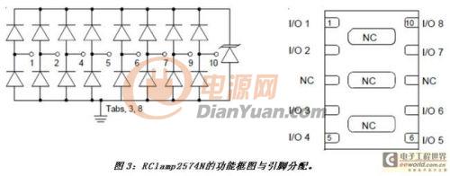 升特公司的最新以太網(wǎng)保護(hù)方案RClamp2574N可滿足并超過所有上述要求。建議將其放置于變壓器的PHY端,盡可能靠近磁體。RClamp2574N可配置為保護(hù)一個(gè)千兆以太網(wǎng)的全部四對差分線對。如圖3所示,八個(gè)I/O引腳中的每一個(gè)都有一個(gè)低電容的控向二極管對,該器件用來將有害的浪涌電流引入內(nèi)部的低壓TVS二極管??叵蚨O管的工作電壓僅有2.5V,采用升特公司專利的EPD工藝技術(shù)制造。低壓導(dǎo)通是一個(gè)很重要的保護(hù)參數(shù),因?yàn)楹芏郟HY芯片都集成了ESD保護(hù)結(jié)構(gòu)。這些結(jié)構(gòu)并非針對承受很大的電能而設(shè)計(jì)。如果它們在外部保護(hù)實(shí)