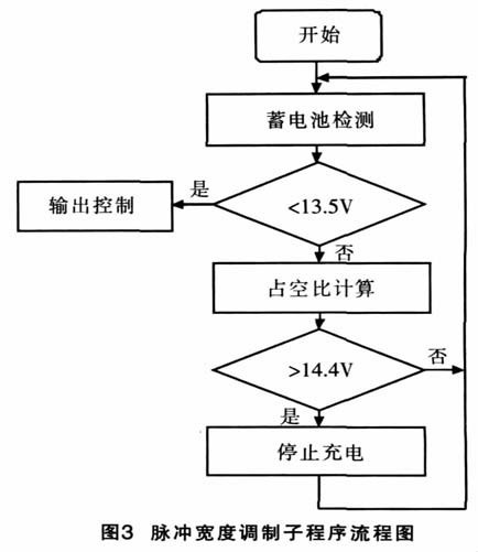 具體方案是,當(dāng)檢測到蓄電池的電壓小于13.5V時,開關(guān)管始終接通,即采取全通充電方式,如果檢測到蓄電池電壓大于13.5V 并小于14.4V 時采取脈寬調(diào)制方式充電,隨著蓄電池電壓的增加,脈寬不斷的變窄,直到蓄電池端電壓上升為14.4V 時,脈寬檢校為0,停止充電。脈寬調(diào)制方式由軟件來實現(xiàn)。