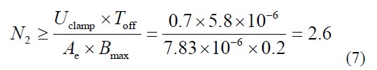 輸入電壓最大值為 Uimax ,開(kāi)關(guān)管的最大耐壓值為 U dsmax,考慮80%的降額使用系數(shù),則電容 C c兩端電壓Uc 的大小可由式(1)確定。