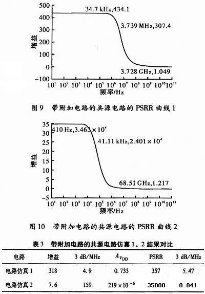 帶附加電路的共源電路如圖7和圖8所示,消除了使用工作以線性范圍內的共源放大器,從VDD到輸出節(jié)點電源波動的影響。