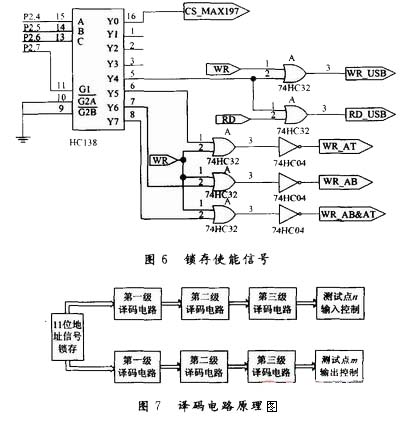 繼電器譯碼電路的作用是在單片機(jī)的控制下將1 536個測試點中的某兩個測試點接入相應(yīng)的測試電路。比如譯碼電路選中測試點1的輸入繼電器Kat和測試點2的輸出繼電器Kab,外部的被測電纜通過這兩個測試點接入相應(yīng)的測試電路,從而實現(xiàn)了導(dǎo)通或者絕緣測試。為了實現(xiàn)這樣的功能譯碼電路可以分為地址鎖存電路,輸入繼電器譯碼電路和輸出繼電器譯碼電路。以輸入地址鎖存電路為例,其原理如圖5,圖6所示。