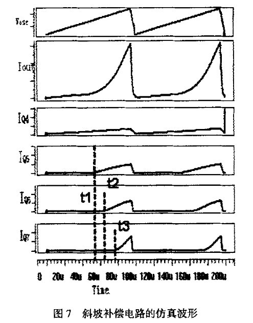圖7是在選取了元件尺寸后計算機仿真波形。其中Vosc是理想化的鋸齒波,Iout是輸出的補償電流,IQ4、IQ5、IQ6、 IQ7分別是Q4, Q5, Q6和Q7的漏極電流,可以看到,為了在占空比小于50%的時候系統(tǒng)更加穩(wěn)定,Q4在每個周期開始時就已經(jīng)開啟,但是電流的斜率較小。隨著Vosc以恒定的斜率上升,將先后在t1, t2, t3時達(dá)到Q5, Q6和07的開啟點。設(shè)Q4, Q5, Q6, Q7開啟后的電流斜率分別為m4, m5, m6和m7,