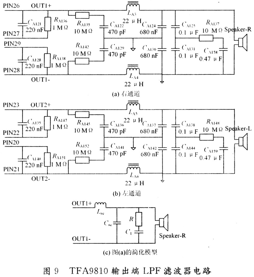 TFA9810T輸出端低通濾波器采用二階巴特沃思濾波器方式,實際的巴特沃思二階濾波器由圖9中RCA類電子元器件CA135/RA145/CA136/LA5/CA137/CA138/RA148/CA159/CA140/CA141/RA152/LA6/CA142/CA144等構(gòu)成,對PWM方波中15 Hz~20 kHz音頻成分表現(xiàn)為直通效應(yīng),對超過音頻范圍的20 kHz以上高頻成分呈現(xiàn)-12 dB/倍頻程滾降率。