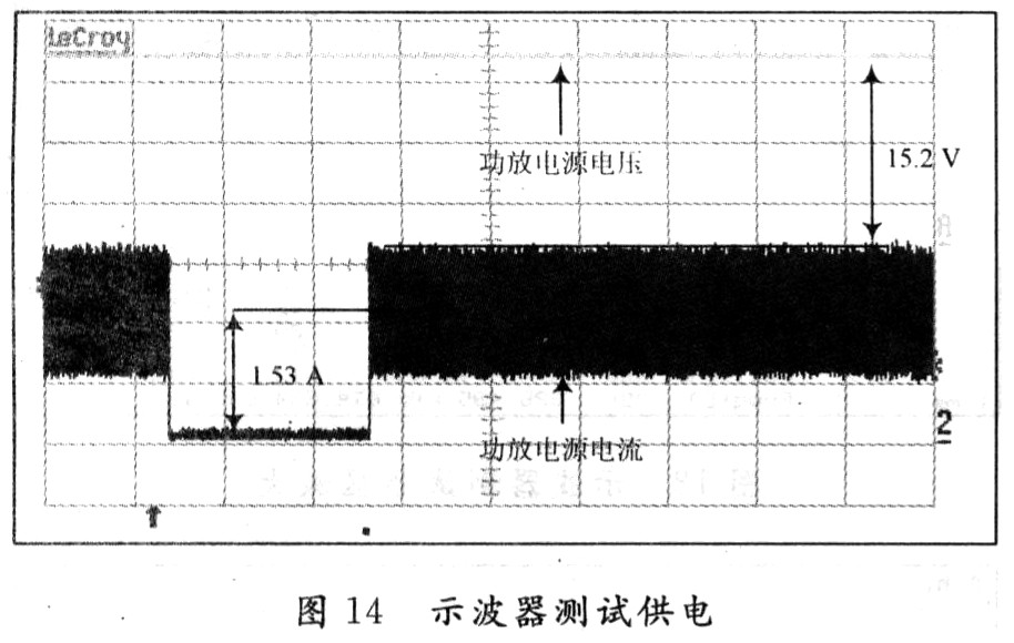 圖14測試了在圖10狀態(tài)下功放TFA9810T的供電電壓、電流實際波形。
