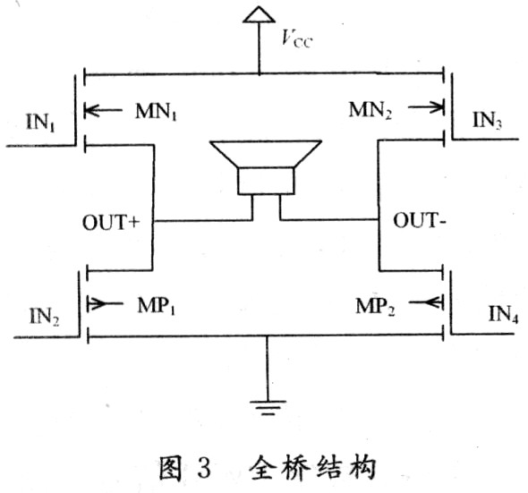 全橋MOSFET管輪流成對導(dǎo)通,理想狀態(tài)一對導(dǎo)通,另一對截止,但實際上功率管的開啟關(guān)斷有一個過程。過渡過程中,必有一瞬間,如圖3所示,在IN1/IN3尚未徹底關(guān)斷時IN2/IN4就已開始導(dǎo)通;因MOSFET全部跨接于電源兩端,故極端的時間內(nèi),可能會有很大的電壓電流同時加在4個MOSFET上,導(dǎo)致功耗很大,整體效率下降,而且器件溫升加劇,燒壞MOSFET,降低可靠性。為避免兩對MOSFET同處導(dǎo)通狀態(tài),引起有潛在威脅的很大短路電流,應(yīng)保證一對MOSFET導(dǎo)通和另一對MOSFET截止期間有一個很短的停滯死區(qū)時間(Dead-time),這個時間由Logic邏輯控制器控制,以有效保證一組MOSFET關(guān)斷后,另一組MOSFET再適時開啟,減小MOSFET損耗,提高放大器效率。