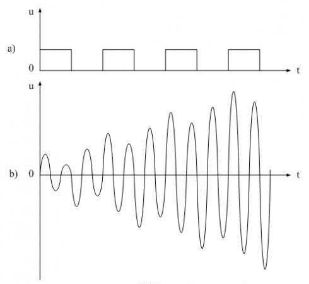 圖6是諧振回路產(chǎn)生諧振的工作原理圖。圖6-a)是一個(gè)含有諧波分量非常豐富的電壓方波,圖6-b)是LC串聯(lián)回路產(chǎn)生諧振時(shí)的電壓波形。當(dāng)電壓方波作用于LC串聯(lián)回路時(shí),方波的前后沿都會(huì)對(duì)LC串聯(lián)回路產(chǎn)生激勵(lì)(即接收能量),每次激勵(lì)過(guò)后又會(huì)產(chǎn)生阻尼振蕩(即損耗能量),當(dāng)輸入電壓波形的上升率dv/dt值大于諧振回路波形(正弦波)的上升率時(shí),電路就會(huì)產(chǎn)生激勵(lì);當(dāng)輸入電壓波形的上升率dv/dt值小于諧振回路波形的上升率時(shí),電路就會(huì)產(chǎn)生阻尼。