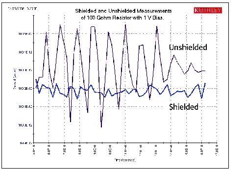 為了減小靜電場影響,被測電路可被密封在一個靜電屏內(nèi)。圖8所示為非屏蔽和屏蔽測量一個100GΩ電阻之間的巨大差異。非屏蔽測量比屏蔽測量時的噪聲要大得多。