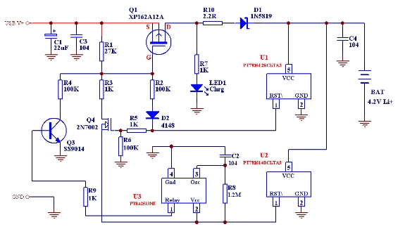 PT7M7433T是上海百利通公司最新設(shè)計(jì)的極高精度的一系列電壓檢測(cè)器的其中一款,其檢測(cè)精度在0-Vcc (5.5V)范圍內(nèi)小于1mV,而且其批量IC的檢測(cè)值偏差<±2.5%,這樣完全保證了批量產(chǎn)品的性能一致性和極高的總體性能,我們利用其配合少量外部電路即可組成相當(dāng)簡(jiǎn)單的鋰電池充電線路。