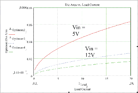 如圖5所示,功耗是裸片面積的函數(shù),周圍是針對輸入電壓為5到12V的頂部MOSFET的最合適值。這清楚地表面,損耗高度依賴于裸片面積以及如果裸片面積增加或減少時這些損耗所增加或減小的劇烈程度。