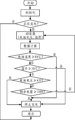 采用充電限壓,電池溫升檢測策略,如蓄電池電36 V,充電截止電壓42.5-43 V,充電截止溫度80℃,充電截止溫升30℃。不過絕大部分時間蓄電池基本處于欠充狀態(tài)。同時通過對電池電壓的數(shù)據(jù)實時采集,利用軟件控制對電池采取限壓保護:通過實時計算電池電量進(jìn)行防過充過放保護,電量為100%時停止充電,電量為20%時停止放電,為延長其壽命,做了第二道防線。圖1 為蓄電池過充保護流程圖。